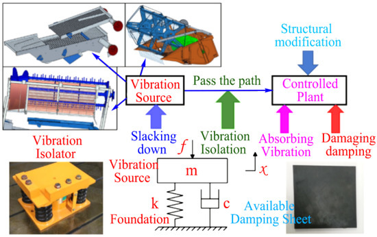 The vibration of the combine harvester has three basic vibration elements of the vibration source, transmission path and controlled objects. As shown in Figure 8, the measures for vibration reducing of three basic vibration elements include reducing vibrations in the vibration source, reducing vibrations between the vibration source and controlled objects in the transmission path and reducing vibrations by installing the power vibration isolator or improving the structural damping.