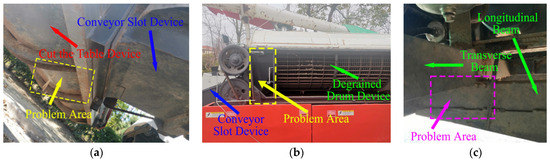 The problem area of vibration transmission paths. (a) The problem area of the cutting table. (b) The problem area of the connection. (c) The problem area of the frame.