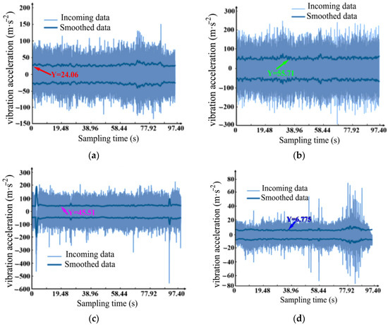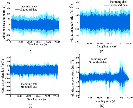 Noise reduction smooth curve of the main working devices. (a) Noise reduction smoothing curve of the cutting table. (b) Noise reduction smoothing curve of the transportation equipment. (c) Noise reduction smoothing curve of the threshing roller. (d) Noise reduction smoothing curve of the connection between the transportation equipment and threshing roller.