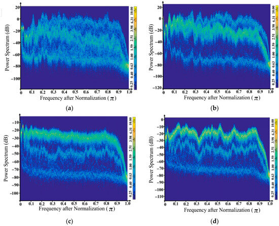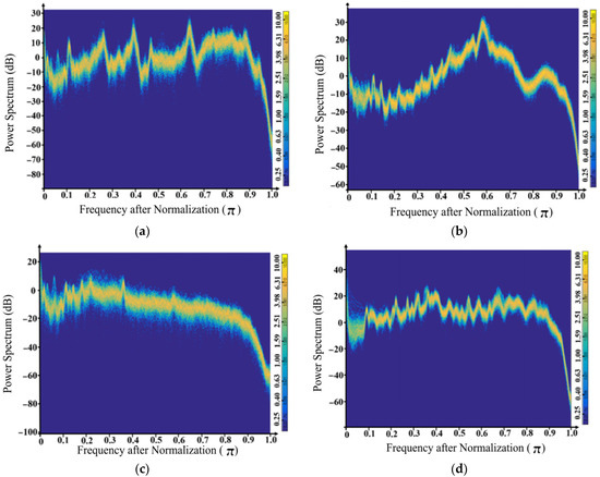The power spectrum of the vibration signals needs to be analyzed to obtain the area of stronger vibrations. The signals of each device obtained by the test are imported into the Signal Analyzer of Matlab for the signal analysis. The sampling time resolution is 663, with a RBW reference frequency of 0.007820 × PI r/sample, after the abscissa of the normalized frequency and the ratio of the reference frequency. The result of the analysis, as shown in Figure 15, the abscissa is the ratio of the frequency normalized to the reference frequency, and the ordinate is the value of the power spectrum. In the figure, the positive values of the power spectrum represent a power increase, the negative values of the power spectrum represent the power decay and if there is a greater number of spectral lines under the same original signal frequency, then the corresponding energy of each spectral line is smaller.