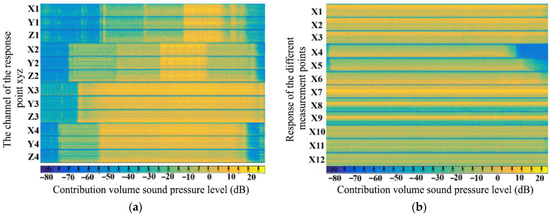 Comparison of the response point channel contributions under multiple working conditions. (a) Comparison of the different channel contributions at the response points. (b) Comparison of the response contributions of different measurement points under multiple working conditions.