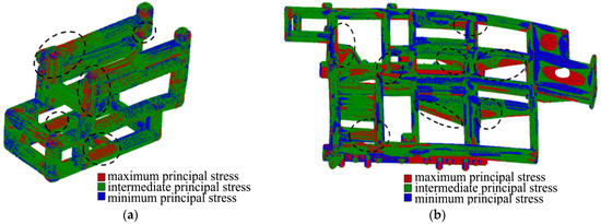 The conclusion of the combine harvester frame simulation analysis can provide theoretical support for reducing the vibration of the harvester. The isometric vector distribution result of the frame excitation force is obtained based on the action of each excitation force. Therefore, the maximum principal stress distribution and key stress area of the combine harvester frame are shown in Figure 18.