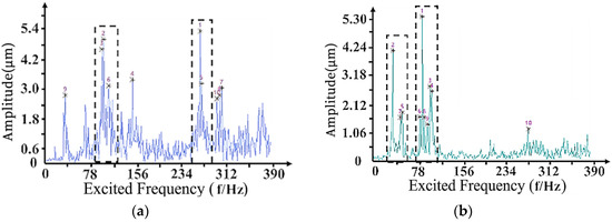 According to the damping optimization principle and the vibration characteristic analysis results, connected to the simulation results of the frame excitation force, the damping sheets installed on the corresponding location need to be optimized. Vibration amplitude curves of the channels with the most obvious changes in the vibration acceleration among the four measure points’ 12 channels of every device are obtained though FFT calculations. The results of the vibration amplitude of the devices before and after the damping optimization are shown in Figure 19 and Figure 20.