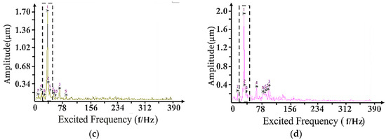 According to the comparison of Figure 19 and Figure 20, this is the conclusion: from the range of the y-axis interval, the amplitude of each point is significantly weakened, and the selected region is the excited frequency of a stronger amplitude. The amplitude distribution areas of measuring points 1 and 2 are obviously wide, but the amplitude is no longer apparent in the distribution areas after the damping optimization experiments, and the maximum amplitudes are significantly concentrated in the middle and low frequency intervals. The peaks from measure point 1 to the four test points are 5.4 μm, 5.3 μm, 1.7 μm and 2.0 μm, respectively, before the damping optimization experiments. After the optimization experiments, the peaks are significantly reduced to 0.81 μm, 1.5 μm, 0.6 μm and 0.6 μm.