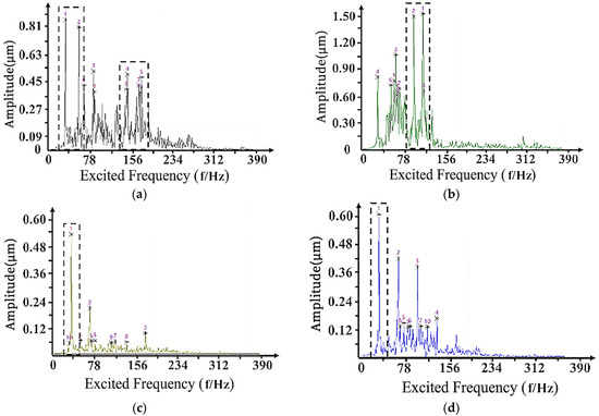 Vibration amplitude before the damping optimization experiments. (a) The amplitude of measure point 1. (b) The amplitude of measure point 2. (c) The amplitude of measure point 3. (d) The amplitude of measure point 4.