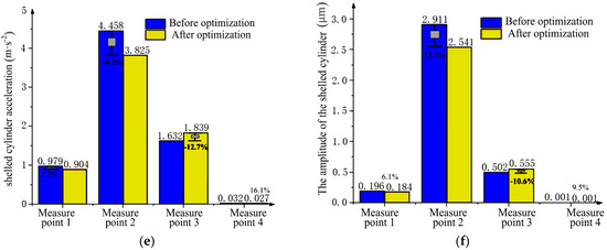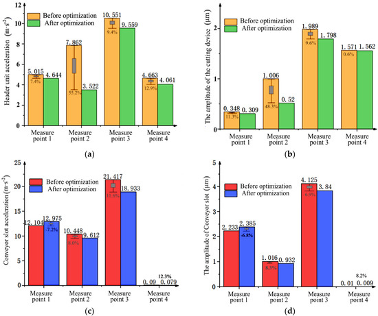 Vibration characteristics changes of working devices before and after damping optimization. (a) Optimize the acceleration before and after the acceleration of the cutting table. (b) Cut optimized before and after amplitude. (c) Optimize the front and rear acceleration of the delivery tank. (d) Optimize the before and rear amplitude of the delivery tank. (e) Optimize the before and after acceleration. (f) Optimize the before and after amplitude of the threshing drum.