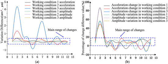 Vibration acceleration change and amplitude change of each device before and after damping optimization. (a) The change difference of the three working conditions of each test point. (b) The percentage difference of the three working conditions of each test point.