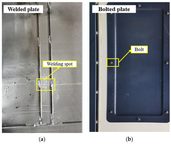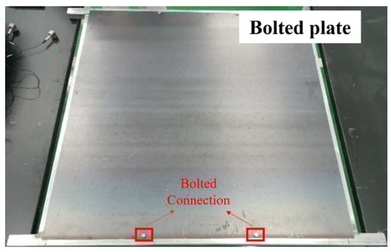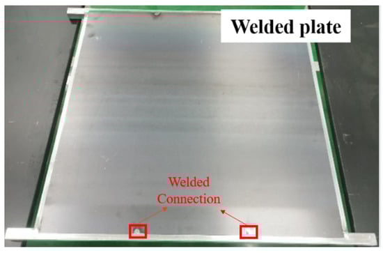 The actual plate structure was fabricated on a 1:1 scale based on the numerical model of the plate and shell structure used in the computational modal analysis, as shown in Figure 9 and Figure 10. Figure 9 shows the plate structure connected by welding. Figure 10 shows the plate structure connected by bolting. The connection points correspond to the numerically modeled connection points.