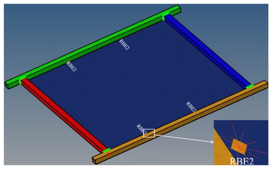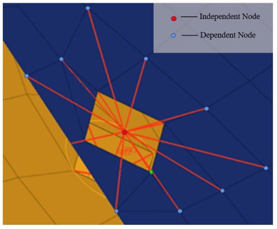 For the plates that need to be disassembled on the combine harvester, the plates are usually connected to the body by bolts. It is easy to simulate the bolted connection in Hypermesh by using RBE2 rigid unit. First, the central node of the bolt hole corresponding to the plate and frame is set as an Independent Node. Next, the node at the boundary of the circular hole is designated as a Dependent Node, creating a rigid connection between the two. Then, the Independent and Dependent Nodes are connected through the RBE2 cell. The RBE2 rigid unit is shown in Figure 3.