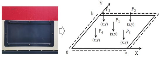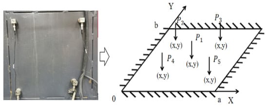 Based on the classical plate and shell theory, the basic assumptions of Kirchhoff’s thin plate theory are used, and the following assumptions are made in this paper: (a) in plate bending, the standard line perpendicular to the midplane before and after deformation still maintains a straight vertical line; (b) when the plate is bending and deforming, σx, σy and τxy are the principal stresses, τxz and τyz are the secondary stresses and σz is even smaller; (c) when the plate is bending, the transverse displacements are identical at all points in the straight line perpendicular to the midplane; (d) no deformation occurs at the midplane during force bending or bending vibration, and there is no displacement of all points in the surface relative to the midplane; (e) when the plate is bent, the transverse displacement w is the same as that of the points on the line perpendicular to the center plane; and (f) the center plane does not deform when the plate is subjected to bending or bending vibration, and there is no displacement relative to the center plane at each point in the plane. According to Kirchhoff’s thin plate theory, the primary differential equation for the transverse vibration of a rectangular thin plate can be expressed as shown in Equation (3).
