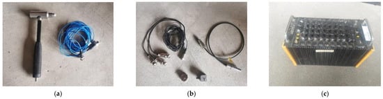 Experimental equipment. (a) Striking hammers and force sensors; (b) Piezoelectric acceleration sensors; (c) Signal acquisition instrument.