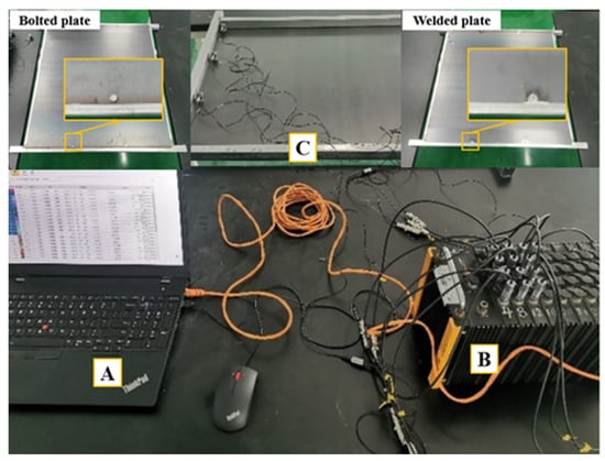 After the test sampling begins, the corresponding test point is hammered (trying to keep the same force each time). The fluctuations in frequency response function, impulse force signal and coherence function of each measuring point were observed in real time by the signal acquisition instrument. The validity of the signal acquisition is judged according to signal fluctuation. During the experiment, the square tube supports of the two types of plate structures were fixed, and the mode test of the middle plate structure was carried out by the hammer method. This experiment adopts the technique of single-point excitation and multi-point pickup. During hammering, we avoided a large amplitude of vibration. Figure 11 shows the field experiment diagram during the modal test of the two types of plate structures. Point A is the signal analysis system. Point B is the signal acquisition instrument. Point C is the acceleration sensor.
