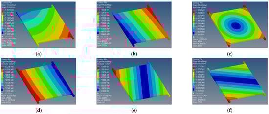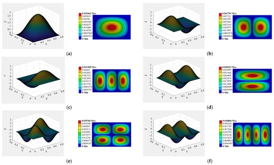 The comparison of the vibration modes is shown in Figure 18. The natural vibration modes of the four-sided fixed support plate obtained by the dynamic equation established by the analytical method in this paper are the same as those obtained by simulation. The first-order natural vibration mode of the four-sided fixed support plate is one and a half waves on the X-axis and one half on the Y-axis. The second natural mode is two half waves on the X-axis and one half on the Y-axis. The third-order natural mode is one and a half waves on the X-axis and two and a half on the Y-axis. The fourth natural mode is three and a half waves on the X-axis and one and a half on the Y-axis. The fifth-order natural mode is two half waves on the X-axis and two half waves on the Y-axis. The sixth natural mode is four and a half waves on the X-axis and one and a half on the Y-axis. By comparing Figure 17 and Figure 18, it can be seen that the first six natural vibration modes of the four-sided fixed support plate and the four-sided simple support plate in this calculation example are entirely consistent.