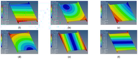 As can be seen from Figure 16, the analytical solution of the natural vibration mode of the four-sided simply supported plate calculated by MATLAB is basically consistent with the numerical solution obtained by Ansys. The first natural vibration mode of the plate is one and a half waves on the X-axis and one half on the Y-axis. The second natural mode is two half waves on the X-axis and one half on the Y-axis. The third-order natural mode is one and a half waves on the X-axis and two and a half on the Y-axis. The fourth natural mode is three and a half waves on the X-axis and one and a half on the Y-axis. The fifth-order natural mode is two half waves on the X-axis and two half waves on the Y-axis. The sixth natural mode is four and a half waves on the X-axis and one and a half on the Y-axis.