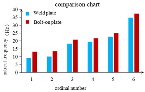As shown in Figure 14, the intrinsic vibration frequencies of the plate and shell structures with different connection methods have significant differences. The first six orders of the intrinsic frequency of the bolted plate are larger than the intrinsic frequency of the welded plate. From the comparison of Figure 12 and Figure 13, it can be seen that the two types of plate and shell structures with different connection methods are basically similar in terms of the modal shapes of each order (except for the rigid body modes). Therefore, the different connection methods only affect the intrinsic vibration frequency of the plate and shell structure, and the intrinsic vibration modes are less affected.