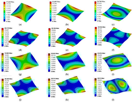 Welded and bolted plate constrained mode shapes. (a) Welded plate first-order intrinsic vibration mode; (b) Welded plate first-order intrinsic vibration mode; (c) Welded plate third-order intrinsic vibration mode; (d) Welded plate fourth-order intrinsic vibration pattern; (e) Welded plate fifth-order intrinsic vibration pattern; (f) Welded plate sixth-order intrinsic vibration pattern; (g) Bolted plate first-order intrinsic vibration mode; (h) Bolted plate second-order intrinsic vibration mode; (i) Bolted plate third-order intrinsic vibration mode; (j) Fourth-order intrinsic vibration pattern of bolted plate; (k) Fifth-order intrinsic vibration pattern of bolted plate; (l) Sixth-order intrinsic vibration pattern of bolted plate.