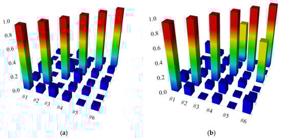 Figure 16 shows the MAC diagrams obtained from the modal tests of the welded and bolted plates. As shown in Figure 16, the correlation between the modal frequencies of each order is close to 0, and the modal shapes of each frequency are independent of each other, which indicates that the modal parameters calculated in this modal test are valid.