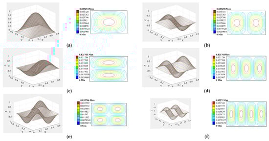 Firstly, the intrinsic shapes and intrinsic frequencies of the four-sided simply supported rectangular thin plate are calculated, and the expressions of the intrinsic shapes are input into MATLAB. Then, the analytical solution of the first six natural modes of the four-sided simply supported plate is obtained by MATLAB through the input of each condition parameter. At the same time, Ansys Workbench is used to establish the corresponding numerical model, set up the boundary conditions and solve the first six orders of intrinsic shapes of the four-sided simply supported plate. The results are shown in Figure 17.