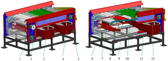 Structural diagram of the MRP-type grading device for potatoes. MRP, movable rotating plate. 1: Drive sprocket; 2: body frame; 3: the first level potato output device; 4: the second level potato output device; 5: bearing seat; 6: MRP; 7: sprocket shaft; 8: intermediate crossbeam; 9: herringbone baffle; 10: slide rail; 11: chain; 12: The third level potato output device.