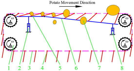 Potato-grading principles schematic diagram: 1: Sprocket; 2: horizontal slide rail height adjustment device; 3: chain; 4: MRP; 5: horizontal slide rail; 6: inclined slide rail; 7: potato; 8: inclined slide rail angle adjustment device.