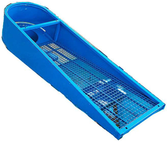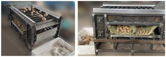 In the actual grading process, to prevent mechanical damage to potatoes in the collection device, the bottom of the collection device was designed with steel wire mesh. It can not only further separate the soil from the potatoes but also significantly reduce the weight to minimize the impact when potatoes are dropped. The collection device is depicted in Figure 6.