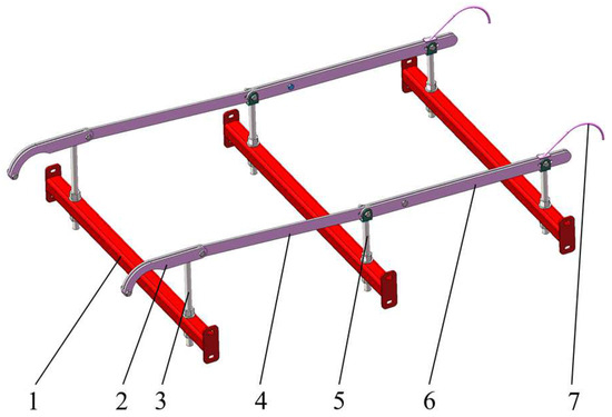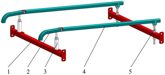 To balance the grading accuracy of first- and second-grade potatoes, the inclined slide rail in the first-generation grading device was initially designed as a single straight square steel tube. However, to facilitate the independent adjustment of the grading results for first- and second-grade potatoes, the inclined slide rail was optimized into two segments. The optimized sliding rail structure, depicted in Figure 5, was divided into the following three segments: horizontal slide rail, first-grade inclined slide rail, and second-grade inclined slide rail. To prevent interference between the MRP at the end of the grading device and the shaft, a slide rail tail rod was designed at the end of the second-grade inclined slide rail.