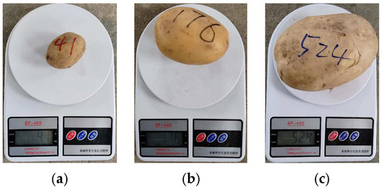 To assess the operational performance of the optimized grading device, a prototype was developed and subjected to performance testing. The experiment utilized potatoes of the common variety “WoTu” from Hohhot, Inner Mongolia Autonomous Region, China. To minimize experimental errors, potatoes of the same variety were selected for the grading test. Before the experiment, manual sorting was performed based on the potato grade specifications [34], outlined in Table 1, to separate potatoes of different qualities. The process involved individually weighing purchased potatoes and labeling them according to size and quality, as depicted in Figure 7.