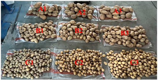 The weighed potatoes were categorized into the following three groups: large, medium, and small. To reduce errors resulting from repeated experiments, each category of potatoes was further divided into three groups, with each group weighing 10 kg, totaling 90 kg. Specifically, large potatoes were labeled as A1, A2, and A3; medium potatoes as B1, B2, and B3; and small potatoes as C1, C2, and C3, as illustrated in Figure 8.