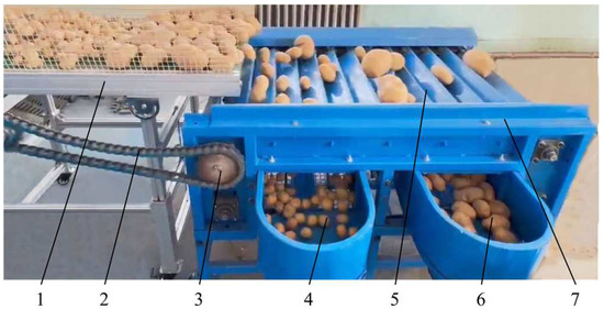 Potato-grading process: 1: conveyor belt; 2: drive chain; 3: sprocket; 4: first-level potato output device; 5: MRP; 6: second-level potato output device; 7: grading device.