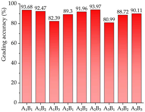 On the basis of the range analysis of the grading accuracy, presented in Table 4, it is evident that within the experimental range, the interaction between factors A and B exerted a more significant influence on the experimental indicators compared to the individual effects of factors A and B alone. Therefore, determining the optimal levels of factors A and B necessitated evaluating the synergy or discordance between their respective levels. Similarly, the interaction between factors B and C demonstrated a more pronounced impact on the experimental indicators than the effect of factor C in isolation. Consequently, determining the optimal levels for factors B and C required assessing how well their respective levels complemented or detracted from each other. The pairing of factors A and B is detailed in Table 5, while the combination of factors B and C is depicted in Table 6.