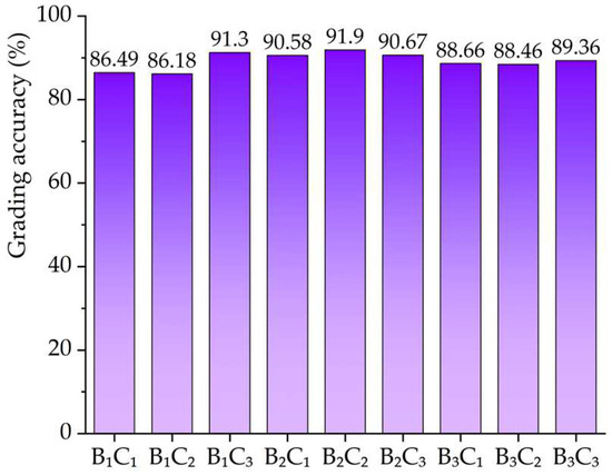 According to the experimental results presented in Table 3, the formula for calculating the combination of each factor’s levels in grading accuracy is provided by Equation (1).