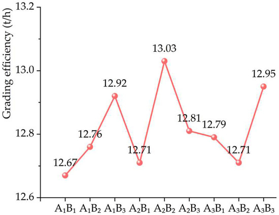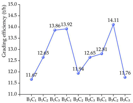 On the basis of the orthogonal experimental results, presented in Table 3, a range analysis was conducted for both grading accuracy and grading efficiency. The analysis results are summarized in Table 4, where Ki represents the sum of the experimental results corresponding to level i in any given column, while ki represents the arithmetic mean of the experimental results obtained when the factor is set to level i in any given column; R denotes the range, which is the difference between the maximum and minimum values of K or k in any given column. In this study, the evaluation criteria for grading performance were grading accuracy and grading efficiency, both of which improve with larger values. Therefore, the optimal level corresponds to the level with the maximum range on any given column. Ultimately, the optimal solution is determined by selecting the solution with the maximum range value for each column.