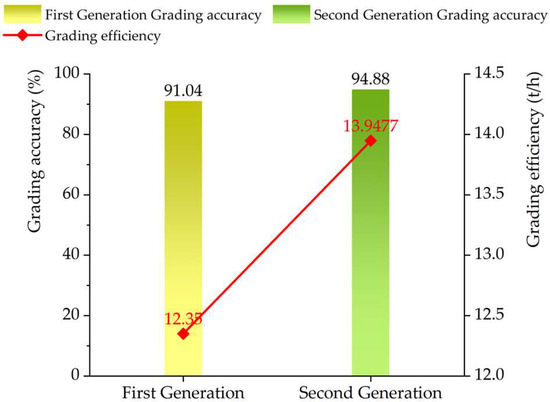 The initial classification device achieved an accuracy of 91.04% and an efficiency of 12.35 t/h [32,33]. Following optimization of its grading performance, the second-generation grading device achieved an accuracy of 94.88% and an efficiency of 13.9477 t/h. The comparison of the grading performance between the first and second generations is illustrated in Figure 15. Post optimization, the classification accuracy increased by 3.84%, and the efficiency improved by 12.94%. Therefore, when processing an equal amount of potatoes, the optimized grading device demonstrates greater practicality and higher production efficiency.