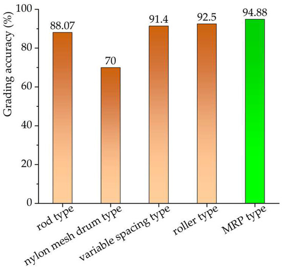 Compared with similar small-scale potato-grading devices, a rod-type potato-conveying and -grading device achieved a grading accuracy of 88.07% in indoor trials at a potato feed rate of 12.67 t/h [10]. A nylon mesh drum-type potato-grading machine attained a grading accuracy of 70% in trials at a potato feed rate of 2.5 t/h [36]. A variable spacing potato-conveying and -grading device achieved a grading accuracy of 91.4% in field trials [37]. A mechanical roller-type potato-grading device achieved a grading accuracy of 92.5% in field trials [38]. A comparative analysis reveals that the MRP-type potato-grading device designed and optimized in this paper possesses higher grading accuracy and efficiency. The grading accuracy comparison of the MRP-type grading device for potatoes with similar small-scale potato-grading devices is depicted in Figure 16.