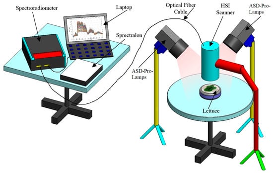 Lettuce plants’ reflectance was measured with ASD FieldSpec 3 (Analytical Spectral Devices Inc., Boulder, CO, USA), which collects reflectance from 350 nm to 2500 nm, with a 1.4 nm sampling interval between 350 and 1050, and a 2 nm sampling interval between 1000 and 2500 nm. Hyperspectral data were subdivided into 1 nm bandwidth using an ASD self-driven interpolation method. Spectral jump correction for 725–1000 nm and 1800–1950 nm bands was performed using the parabolic correction equations [28]. The hyperspectral image (HSI) data acquisition set (Figure 1) comprised ASD-Pro halogen lamps, ASD FieldSpec, a computer, a Spectralon reflectance standard, and connection wires.