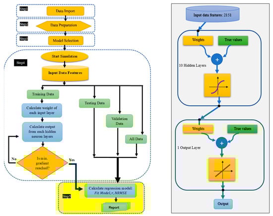 In the training phase of the ANN model, we applied the Levenberg–Marquardt method [36], which is a built-in function in the MATLAB package (MathWorks 2023, Natick, MA, USA) for linear and non-linear least squares methods.