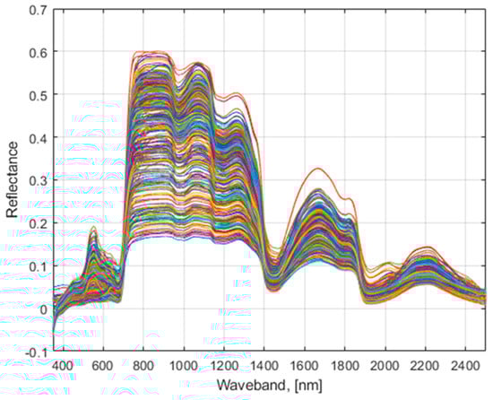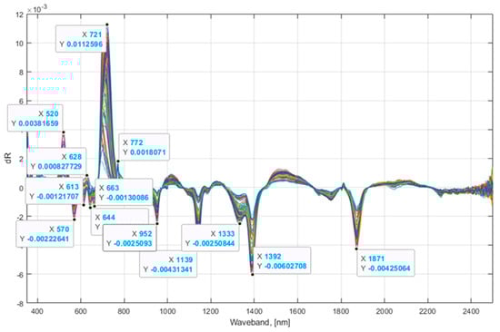 The captured hyperspectral data of the whole lettuce plant as elaborated in Section 2.3 were filtered using a seven-point moving average digital filter. The filtered hyperspectral reflectance data of all studied lettuce accessions (Figure 3) exhibit six volatile bandwidth regions as found using FDR simulations.