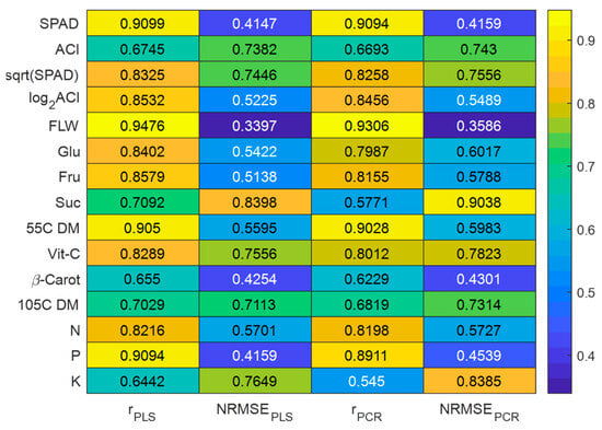 In addition to the laboratory-measured values for 13 response variables, two more adjusted values were calculated as follows: a square root of SPAD and logarithm (base 2) of ACI as previously recommended [38]. The computed FDR of reflectance values show that the 13 most important principal components were found in seven different bandwidth regions, i.e., 500–575, 600–675, 700–775, 950–1000, 1100–1150, 1300–1400, and 1875–2000 nm based on the maximum or minimum reflectance derivative values (Figure 4). These bandwidth regions are in close agreement with those determined previously on lettuce [39]. Correlations between the predicted values and laboratory measurements (ground truth) for multivariate linear PLSR and PCR models ranged from 0.5450 to 0.9476 (Figure 5), while NRMSE values ranged between 0.3397 and 0.9038. The highest correlation (0.9476 and 0.9306) between the predicted values found using PLS and PCR multivariate models and laboratory-measured values was observed for fresh leaf weight (FLW). The lowest correlation (0.6442 and 0.5445) between modeled and measured data was observed for the potassium (K) content. These correlation values show the range of values from minimum to maximum, which were found after several iterative simulations. The correlation values of PLSR and PCR models to estimate SPAD, N, P, and K nutrients were lower than those found in our previous studies [17,18]. This difference may be related to the scanning approach used on analyzed plants. In the current study, the whole lettuce plants were scanned using the hyperspectral camera, whereas, in our previous study, hyperspectral images were collected from individual lettuce leaves placed in a fully isolated chamber. Correlations for N, P, and K content determined in the current study using PLSR and PCR models are, however, in close agreement with the results from other laboratories [21]. The accuracy of the PLSR and PCR models were higher for N and P, but lower for K in our study than previously reported accuracies for the PLSR models [40].