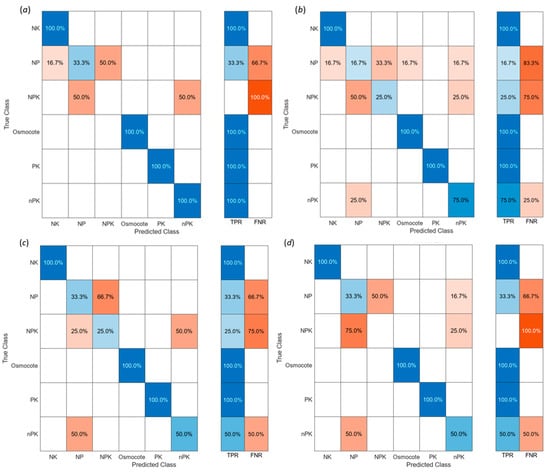 To classify the applied six fertilizer treatments (PK, NK, NP, NPK, nPK, and Osmocote) for all studied lettuces and the collected hyperspectral image data, four different machine learning classification algorithms (SVM, ensemble, linear and quadratic discriminant) were implemented and tested. The filtered HSI data were taken as an input variable and the applied six treatments, converted to categorical arrays, and used as an output variable. To reduce the dimension of the input (predictor) variable data, i.e., HSI data, 13 wavebands of HSI, and 13 principal component values found using FDR reflectance values (Figure 4), were used. HSI data were classified based on the six applied fertilizer treatments. A total of 90% of 300 data sets were used for model training, and 10% were used for model testing/validation. The employed classification scales were individual classes—TP, FP, TF, FN—and the combined classes—TPR (true positive rates) and FNR (false negative rates). The plotted confusion matrices of the employed algorithms (Figure 6) show that the highest accuracy (77.8% for model training and 73.3% for model testing/validation) in classifying the applied treatments was achieved with the ensemble algorithm (Figure 6a). The second-highest accuracy (75.9% for model training and 70.0% for model testing/validation) of classification was reached using the SVM algorithm (Figure 6b). The other two algorithms, quadratic discriminant (Figure 6c) and linear discriminant (Figure 6d), resulted in 74.7% and 80% for model training, and 70.0% and 66.7% accuracy for model testing/validation, respectively. A total of 100% accuracy was achieved in classifying lettuces using SVM, ensemble, linear, and quadratic discriminant algorithms when NK, Osmocote, and PK treatments were applied (Figure 6a–d). This demonstrates that NK, Osmocote, and PK fertilizers have significant effects on the leaf pigment content. Similar conclusions (Figure 6a,b) can be drawn with adequate confidence about the nPK treatment effect. On the other hand, NP and NPK treatments (Figure 6a–d) had a very small or no effect on lettuce leaf pigments, and therefore, the hyperspectral imaging technique could not detect the impact of NP and NPK treatments.