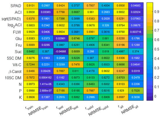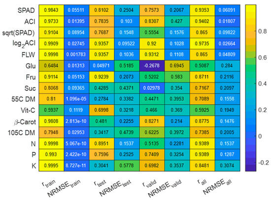 When the original data and the ANN model were applied, the highest correlations between the estimated nutrient values and laboratory-measured values were detected for fresh leaf weight (FLW), log2(ACI), N, P, K, SPAD, and β-carotene in the model training phase (r = 0.9808 … 0.9998), testing (r = 0.7500 … 0.9357), and validation (r = 0.8480 … 0.9400) (Figure 7). The accuracy of the estimation models for N, P, and K contents is in good agreement with the accuracy of the models developed using back propagation neural networks and random forest algorithms [40]. The lowest correlation between the estimated and ground truth values was found for Vit-C, Glu, Fru, 55C DM, 105C DM, and the square root of SPAD, which also showed much higher NRMSE values (Figure 7).