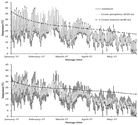 Throughout storage, the interplay between grain temperature, moisture content (MC), and internal atmosphere significantly influences biological activity, thereby impacting the quality of the grain. The temperature of the grain within the bag at any given moment is contingent upon various factors, including its initial temperature at the time of bagging (with diminishing influence over time), solar radiation exposure, heat emissions from biotic respiration, and thermal exchange with the ambient air and the soil upon which the bag is laying [8]. Previous studies have established key insights regarding temperature dynamics. Firstly, the temperature at the top grain layer (0.1 m depth) follows the distinctive pattern of the ambient air temperature, reaching its maximum at noon and minimum during the early morning [5,9]. The daily temperature oscillation decreased with the grain depth, being not noticeable at 0.4 m from the surface [10]. Secondly, bulk grain temperature decreases from summer to winter and rises from winter to summer, gradually aligning with the prevailing ambient temperature of each season [5,6,9,10,11].