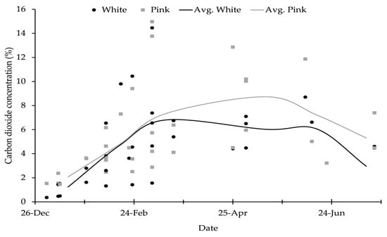 The evolution of the internal atmosphere was similar in both bag colors (Figure 3). During the first two weeks of storage, CO2 concentrations in all bags remained below 3%, subsequently increasing steadily with storage time until April, reaching average values of approximately 6 in the white bags and 8% in the colored bags, with some absolute values reaching 15%. From April to June, CO2 concentrations gradually decreased to approximately 5%.