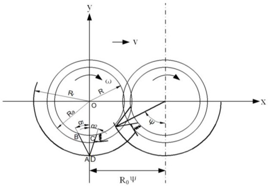 The movement process of a duckbilled hole-forming device during operation is shown in Figure 2, where V is the forward speed, m/s; R is the radius of the hole-forming device, mm; Rr is the radius of the apex of the fixed duckbill, mm; α1 is the angle between the fixed duckbill AB and OA, °; α2 is the angle between the moving duckbill AC and OA, °; H is the hole sowing depth, mm; Ψ is the duckbill movement angle, °. R0 is the rolling radius of the hole-forming device, r = R/(1 − µ), mm; and μ is the slip coefficient.