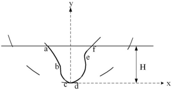 From the trajectory of the hole-forming device and the process of hole-forming, it can be seen that the soil hole contour is composed of five curves, namely a–b, b–c, c–d, d–e, and e–f in Figure 3. The soil hole point in the diagram is taken as the coordinate origin O, and the rectangular coordinate system is established. The b–c and d–e segments are the motion trajectories of the tip point A of the fixed duckbill. Substituting r = Rh into Equation (1), the parametric equations of the b–c and d–e segments can be obtained as follows: