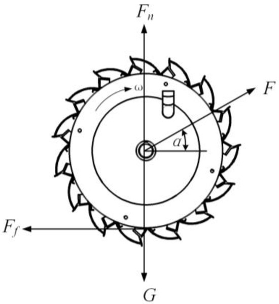 The traction machinery mainly drives the movement of the hole-forming device, and the different traction angles affect the trajectory of the duckbill of the hole-forming device. The hole-forming device rolls on the soil when the whole machine moves forward. The forces on the hole-forming device can be simplified as gravity, friction, support between the hole-forming device and the soil, and traction. The forces on the hole-forming device are shown in Figure 4.