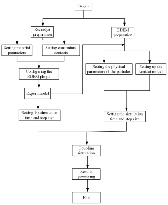 During the rolling process, the hole-forming device interacts with the soil, causing the velocity of the soil particles to change, and the velocity size of soil particles is a direct response to the degree of disturbance of the soil during the hole-forming process. In order to visualize the disturbance of the duckbill on the soil particles, a duckbill model was imported into the EDEM 2022 software during the coupling process [15,26,27,28]. The simulation time is set to 1 s, the step length is 2 × 10−4 s in the EDEM software, and the simulation time is set to 1 s. The step length is set to 500 in the RecurDyn V9R5 software; the traction angle is 20°, the mass of the hole-forming device is 17 kg, the forward speed of the hole-forming device is 1.11 m/s as the parameter, and the specific process is shown in Figure 5.