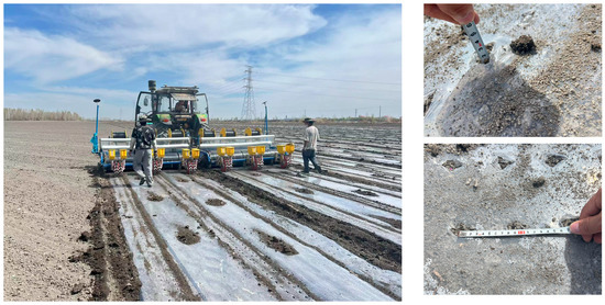 The research team conducted a series of field tests to verify the accuracy and reliability of the simulation model in practical application. The critical operating parameters were strictly set as follows: traction angle of 17.3°, forward speed of 1.11 m/s, and mass of the hole-forming device of 17.9 kg. The test site was selected in a test field belonging to Shihezi University in Shihezi City, Xinjiang Uygur Autonomous Region, where the typical soil and climatic conditions provided an ideal natural environment for the tests.
