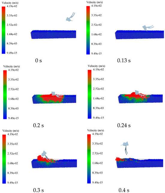 The simulation results are shown in Figure 8, and the time points of 0 s, 0.13 s, 0.2 s, 0.24 s, 0.3 s, and 0.4 s are selected for analysis. It was observed that before 0.13 s, as the duckbill had no contact with the soil, the soil particles had no perturbation, and the velocities were all 0 m/s; at 0.13~0.2 s, the duckbill broke through the soil, and the velocities of some of the soil particles became bigger; at 0.2~0.24 s, the duckbill was inserted into the soil, and the moving duckbill beak was opened, and the perturbation to the soil reached the maximum; at 0.24~0.3 s, the duckbill slipped out from the soil, and the disturbance gradually decreased; at 0.3~0.4 s, the duckbill left the soil, there was no contact with the soil, and the velocity of soil particles gradually decreased to 0 m/s.
