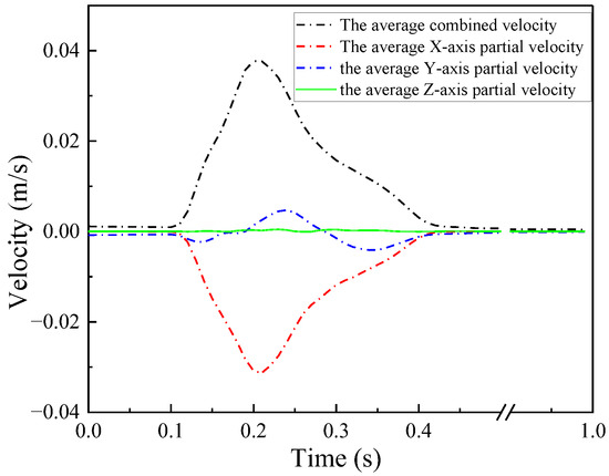 To further investigate the direction of soil particle movement and the variation patterns of the particle velocities in various axial directions under the action of the hole-forming device, a simulation analysis was conducted to examine the average combined velocity of soil particles and the average component velocities along each axis throughout the process from the duckbill’s entry into the soil to its emergence. The simulation results are shown in Figure 9; before 0.13 s, the average combined velocity and the average partial velocity of each axis were 0 m/s. From 0.13 s to 0.4 s, the average combined velocity and the average X-axis partial velocity changed obviously, and the average X-axis partial velocity was negative, the velocity in the Y-axis direction increased first in the negative direction, then in the positive direction and then in the negative direction, and then finally became 0 m/s, and the velocity in the Z-axis direction did not fluctuate; at 0.4~1 s, the average combined velocity and the average partial velocity of each axis returned to 0 m/s. The results show that during the process of duckbill hole forming, the disturbance of the soil is mainly concentrated in the X-axis direction, and the rolling process of the duckbill squeezes the soil and drives the soil particles to move along the negative direction of the X-axis to cause hole formation.