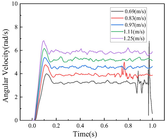At 0.8~0.9 s, the angular velocity of the hole-forming device fluctuates wildly when moving at a forward speed of 0.69 m/s. This is because the duck’s beak disturbs the soil more when the speed is too low, pulling up the small pieces of soil, resulting in a minor rolling resistance and an instantly more significant angular velocity, which then comes into contact with the soil. The angular velocity decreases to an average value.